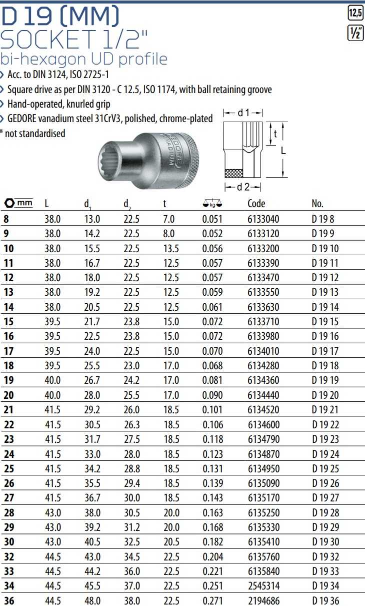 - Khẩu chụp bulong Gedore D 19 22, đầu chụp bulong Gedore D 19 22, Gedore Socket D 19 22 là loại đầu khẩu công nghiệp, chuyên dùng để siết bulong, có size đầu vào vuông 1/2", size đầu ra 22 mm. Đầu chụp bulong Gedore D 19 22 được chế tạo từ thép cường lực có độ dai va đập cao.