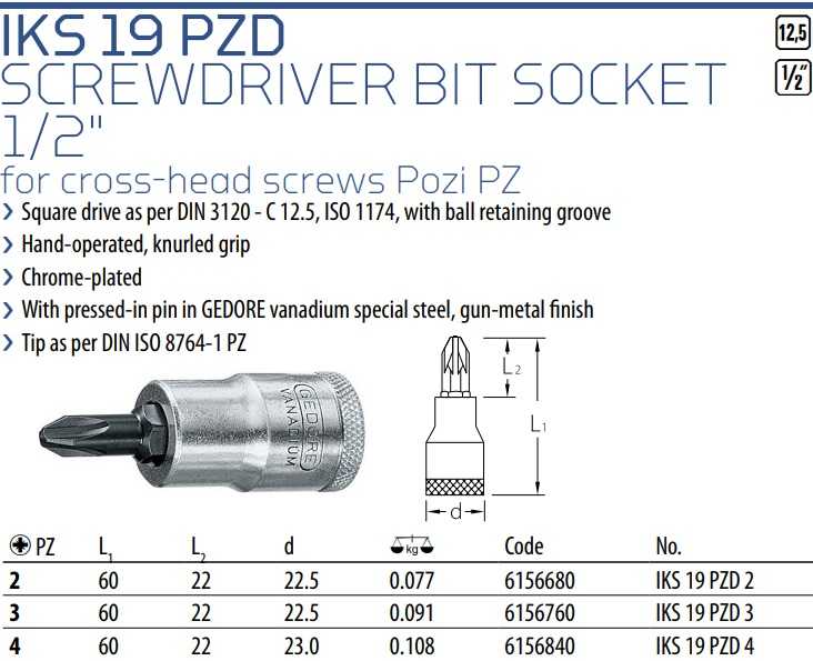 - Khẩu chụp bulong Gedore IKS 19 PZD 2, đầu chụp bulong Gedore IKS 19 PZD 2, Gedore Socket IKS 19 PZD 2 là loại đầu khẩu công nghiệp, chuyên dùng để siết bulong, có size đầu vào vuông 1/2", size đầu ra PZ 2. Đầu chụp bulong Gedore IKS 19 PZD 2 được chế tạo từ thép cường lực có độ dai va đập cao.