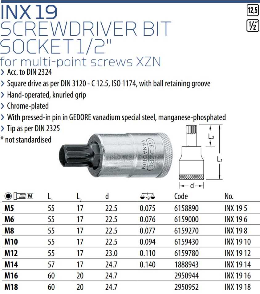 - Khẩu chụp bulong Gedore INX 19 16, đầu chụp bulong Gedore INX 19 16, Gedore Socket INX 19 16 là loại đầu khẩu công nghiệp, chuyên dùng để siết bulong, có size đầu vào vuông 1/2", size đầu ra M16. Đầu chụp bulong Gedore INX 19 16 được chế tạo từ thép cường lực có độ dai va đập cao.