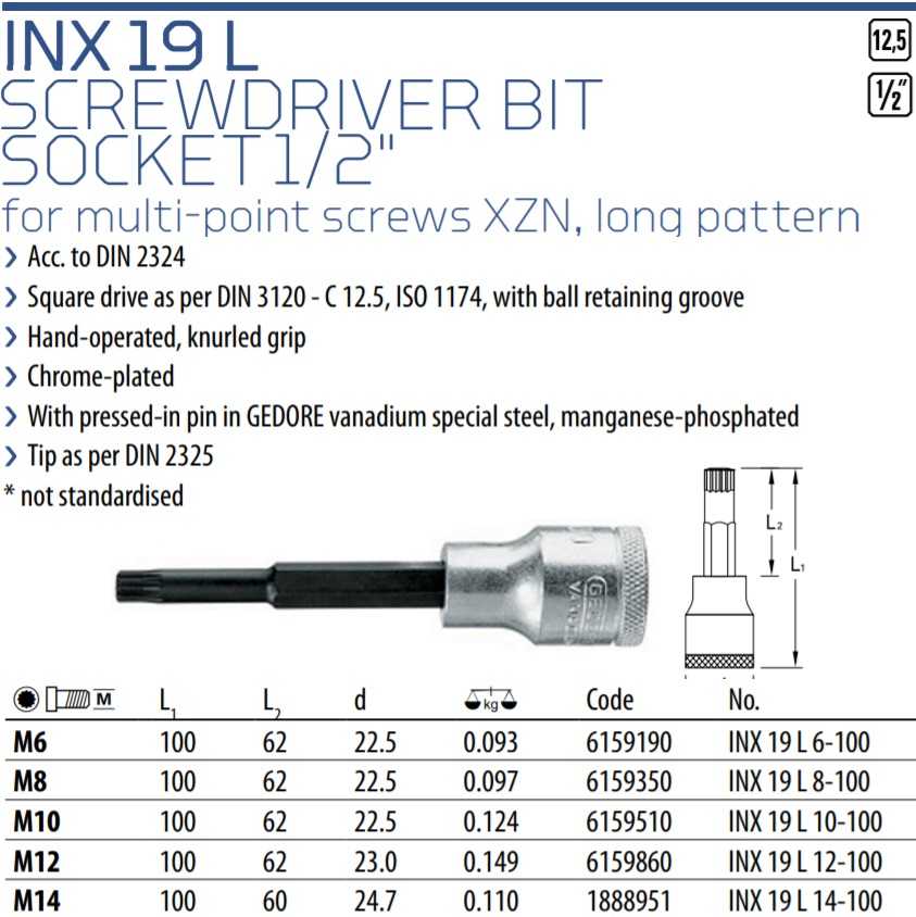 - Khẩu trắng INX 19 L 14-100 thuộc dạng đầu khẩu cơ bản, dạng dài có chiều dài: 100 mm. Sử dụng phổ biến cho các thiết bị siết tay, hoặc súng siết có xung lực va đập nhỏ.