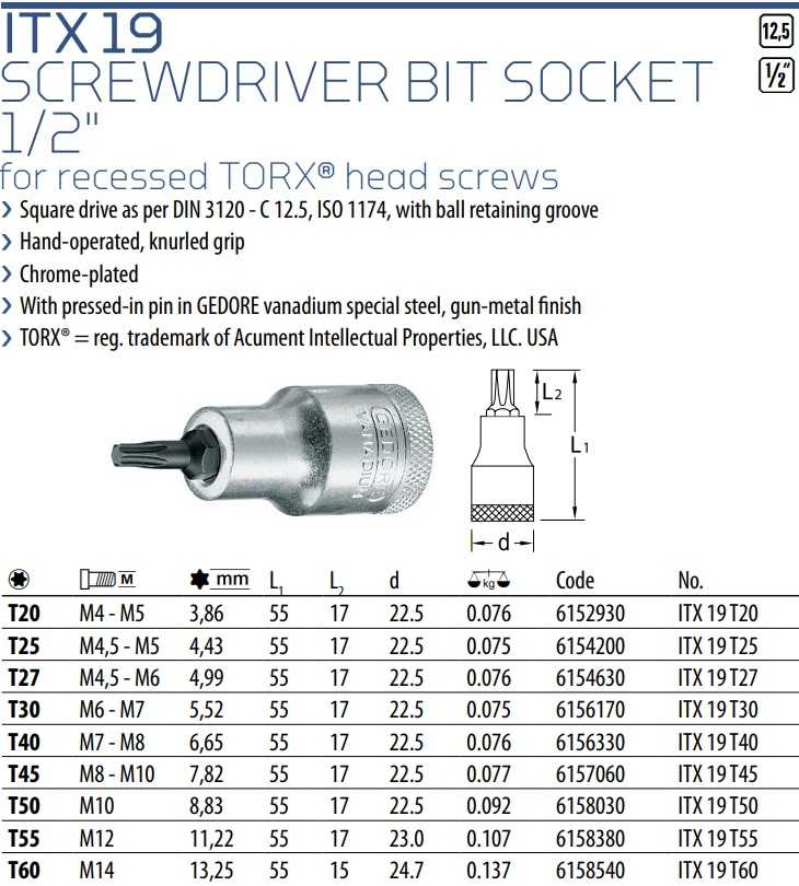 KHẨU CHỤP BULONG GEDORE ITX 19 T30 | ĐẦU CHỤP BULONG GEDORE ITX 19 T30 | 1/2" | T30