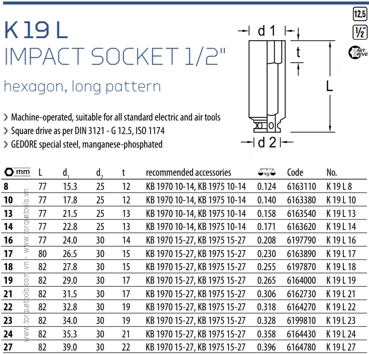 - Khẩu đen 6 cạnh dài Gedore K 19 L 23 thuộc dạng đầu khẩu cơ bản, dạng dài có chiều dài: 82 mm. Sử dụng phổ biến cho các thiết bị, súng siết có xung lực va đập cao.