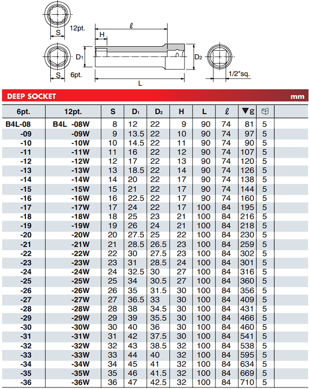 - Khẩu trắng 12 cạnh KTC B4L-17W thuộc dạng đầu khẩu cơ bản, dạng dài, có chiều dài: 90 mm. Sử dụng phổ biến cho các thiết bị siết tay, hoặc súng siết có xung lực va đập nhỏ.