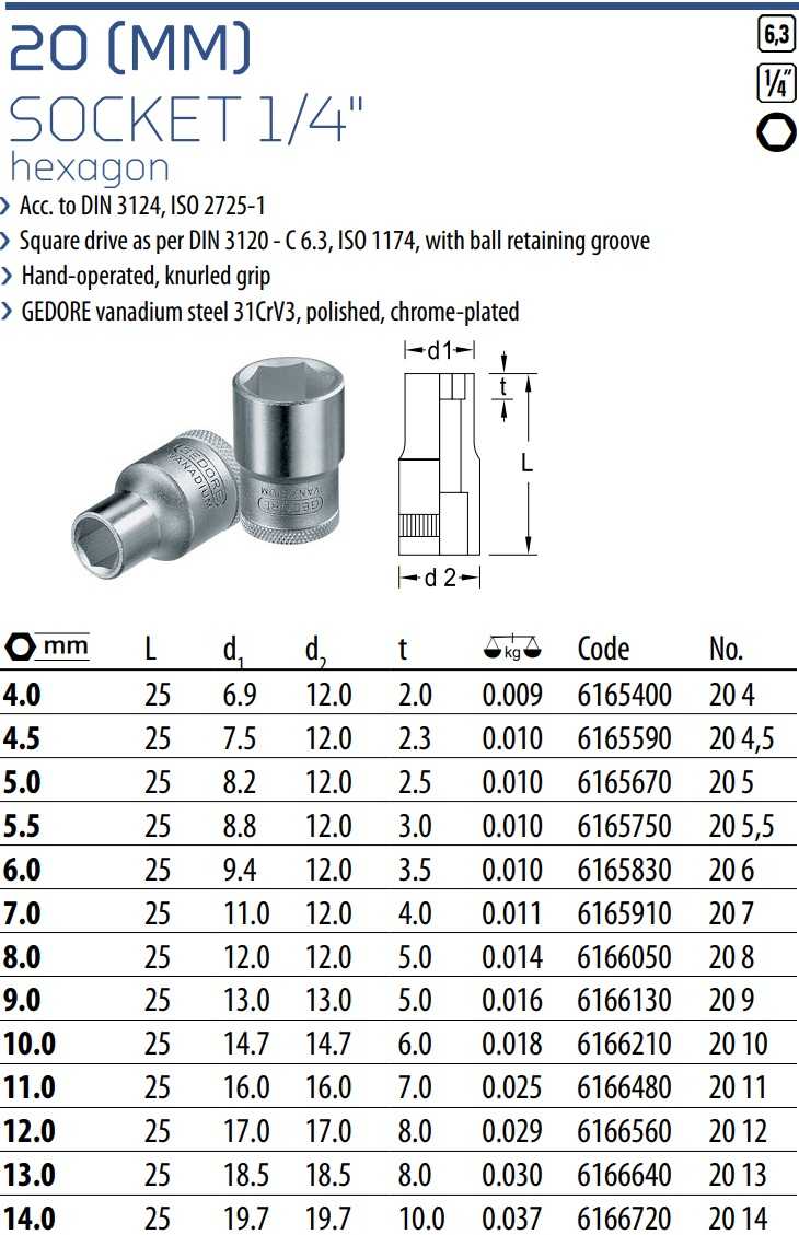 KHẨU CHỤP BULONG GEDORE 20 4,5 | ĐẦU CHỤP BULONG GEDORE 20 4,5 | 1/4" | 4.5 mm