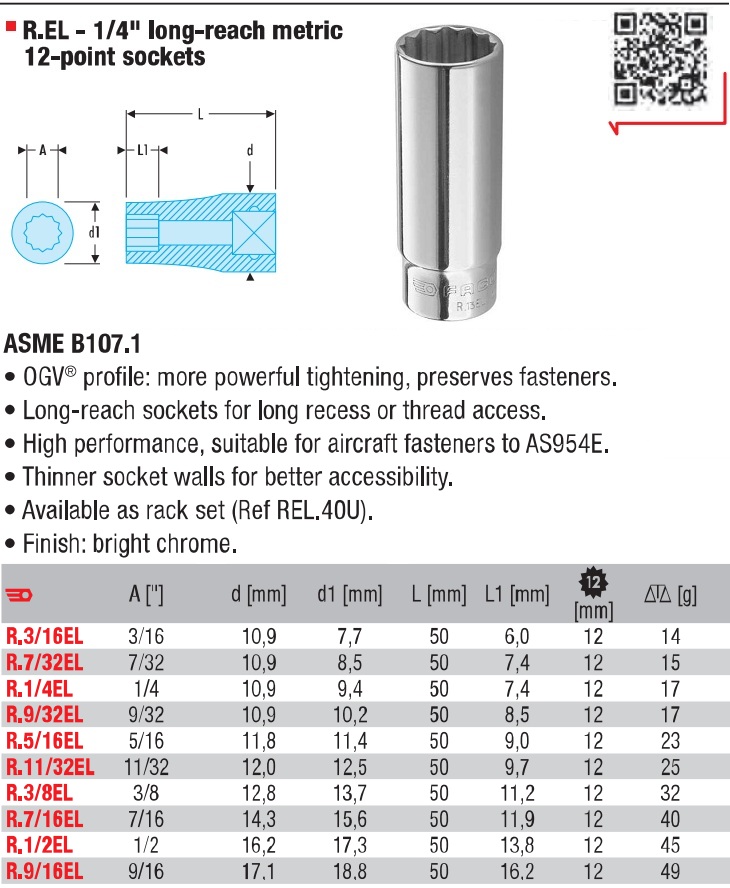 - Khẩu trắng 12 cạnh dài Facom R.3/16EL thuộc dạng đầu khẩu cơ bản, dạng dài có chiều dài: 50 mm. Sử dụng phổ biến cho các thiết bị siết tay, hoặc súng siết có xung lực va đập nhỏ.