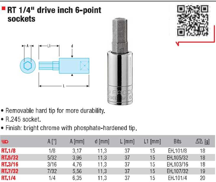 - Khẩu trắng 6 cạnh ngắn Facom RT.7/32 thuộc dạng đầu khẩu cơ bản, dạng ngắn có chiều dài: 37 mm. Sử dụng phổ biến cho các thiết bị siết tay, hoặc súng siết có xung lực va đập nhỏ.