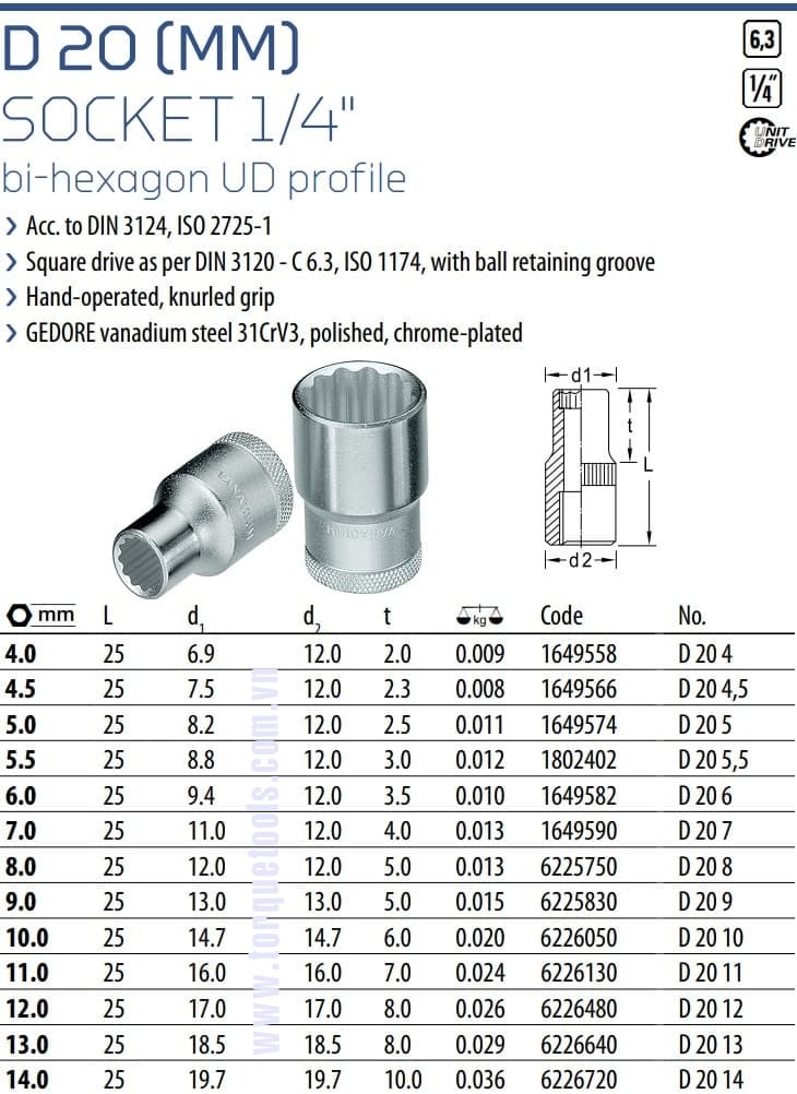 - Khẩu trắng Gedore D 20 14 thuộc dạng đầu khẩu cơ bản, dạng ngắn, có chiều dài: 25 mm. Sử dụng phổ biến cho các thiết bị siết tay, hoặc súng siết có xung lực va đập nhỏ.