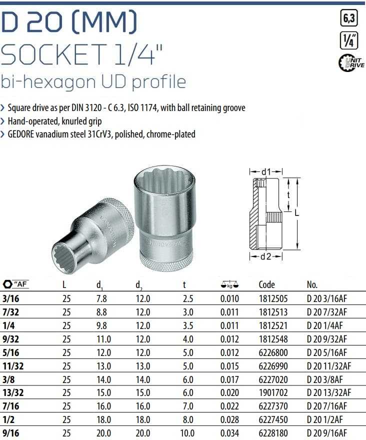 KHẨU CHỤP BULONG GEDORE D 20 3/8AF | ĐẦU CHỤP BULONG GEDORE D 20 3/8AF | 1/4" | 3/8"