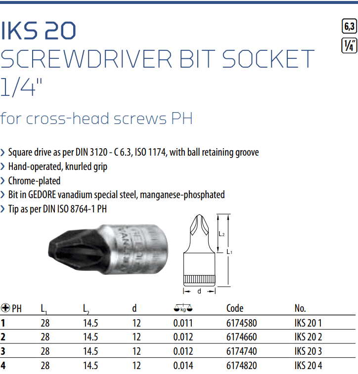 - Khẩu chụp bulong Gedore IKS 20 4, đầu chụp bulong Gedore IKS 20 4, Gedore socket IKS 20 4 là loại đầu khẩu công nghiệp, chuyên dùng để siết bulong, có size đầu vào vuông 1/4", size đầu ra PH 4. Đầu chụp bulong Gedore IKS 20 4 được chế tạo từ thép cường lực có độ dai va đập cao.