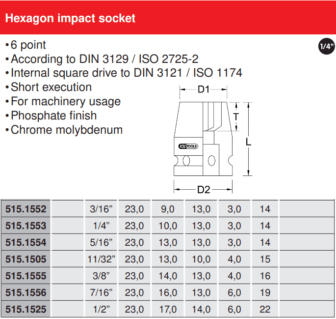 - Khẩu chụp bulong KS Tools 515.1554, đầu chụp bulong KS Tools 515.1554, KS Tools impact socket 515.1554 là loại đầu khẩu công nghiệp 6 cạnh, chuyên dùng để siết bulong, có size đầu vào vuông 1/4", size đầu ra 5/16". Đầu chụp bulong KS Tools 515.1554 được chế tạo từ thép đen cường lực có độ dai va đập cao.