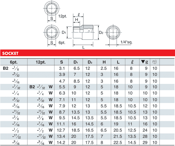 - Khẩu trắng 12 cạnh KTC B2-1/4W thuộc dạng đầu khẩu cơ bản, dạng dài, có chiều dài: 18 mm. Sử dụng phổ biến cho các thiết bị siết tay, hoặc súng siết có xung lực va đập nhỏ.