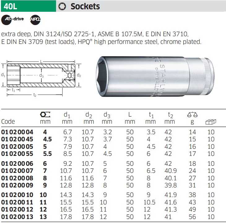 - Khẩu trắng 6 cạnh dài Stahlwille 01 02 00 10 thuộc dạng đầu khẩu cơ bản, dạng dài có chiều dài: 50 mm. Sử dụng phổ biến cho các thiết bị siết tay, hoặc súng siết có xung lực va đập nhỏ.