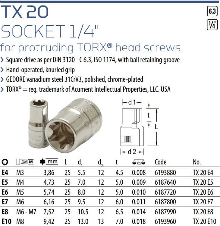 - Khẩu trắng Torcx E Gedore TX 20 E6 thuộc dạng đầu khẩu cơ bản, dạng ngắn, có chiều dài: 25 mm. Sử dụng phổ biến cho các thiết bị siết tay, hoặc súng siết có xung lực va đập nhỏ.