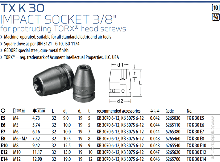 - Khẩu đen 6 cạnh ngắn Gedore TX K 30 E10 thuộc dạng đầu khẩu cơ bản, dạng ngắn có chiều dài: 32 mm. Sử dụng phổ biến cho các thiết bị, súng siết có xung lực va đập cao.