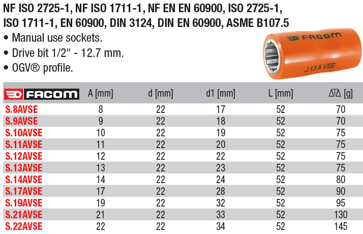 - Đầu chụp bulong cách điện Facom S.8AVSE được chế tạo từ thép với lớp phủ bọc ngoài cách điện theo tiêu chuẩn DIN 7448, DIN 3124, ISO 1174 và IEC 60900.