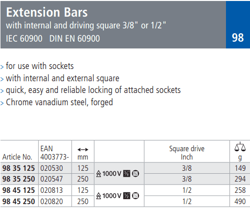 - Khẩu Knipex 98 45 250 sử dụng phổ biến cho các thiết bị siết lực chuyên dụng có xung lực cao trong môi trường điện cao thế < 1.000 V (Súng siết bulong, cờ lê thủy lực).