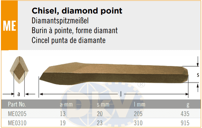 - Đột lỗ chống cháy nổ Ampco ME0205, Ampco non sparking center punch ME0205 có đường kính đầu: Ø 13 mm, chiều dài tổng thể 205 mm, chuyên dùng để đột mở rộng lỗ trong môi trường yêu cầu tính phòng chống cháy nổ.