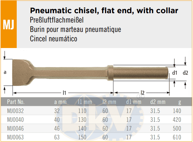 - Đục chống cháy nổ Ampco MJ0063, Ampco non sparking cape chisel MJ0063 có bề rộng đục: Ø 63 mm, chiều dài tổng thể 210 mm, chuyên dùng để đục phá trong môi trường yêu cầu tính phòng chống cháy nổ.