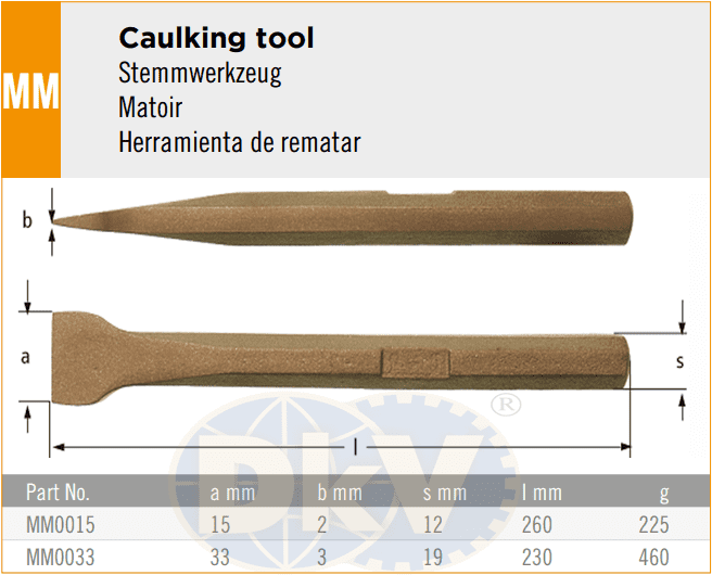 - Đục chống cháy nổ Ampco MM0015 được chế tạo bằng hợp kim đồng/bery (Cu Be) hoặc đồng/nhôm (Br Al), tuyệt đối không phát tia lửa khi va chạm.