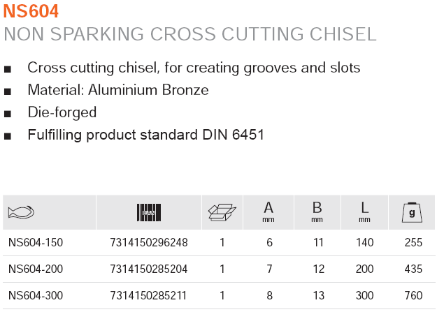 - Đục chống cháy nổ Bahco NS604-300, Bahco non sparking cutting chisel NS604-300 có chiều dày lưỡi: 8 mm, bề rộng chuôi đục : 13 mm, chiều dài tổng thể 300 mm, chuyên dùng để đục phá trong môi trường yêu cầu tính phòng chống cháy nổ.