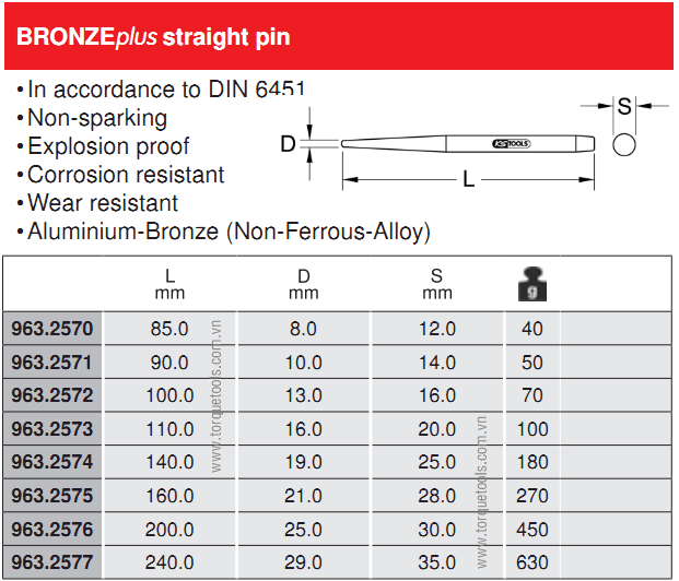 - Đục chống cháy nổ KS Tools 963.2574, KS Tools non sparking straight pin 963.2574 có đường kính đầu đột: Ø 19 mm, đường kính đầu chuôi 25 mm, chiều dài tổng thể 140 mm, chuyên dùng để đục phá trong môi trường yêu cầu tính phòng chống cháy nổ.