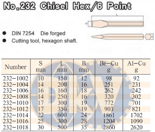 - Đục phẳng chống cháy nổ X-Spark 232-1004 được chế tạo bằng hợp kim đồng/bery (Cu Be), tuyệt đối không phát tia lửa khi va chạm.