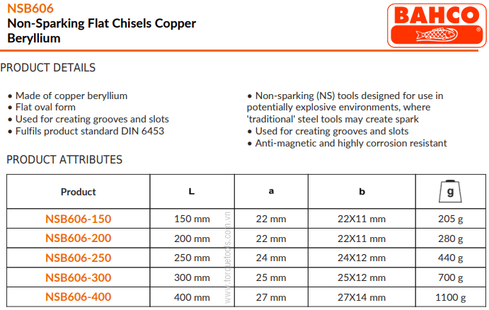 - Đục phẳng chống cháy nổ Bahco NSB606-150 được chế tạo bằng hợp kim đồng/nhôm (Br Al), chế tạo theo tiêu chuẩn DIN 6453, tuyệt đối không phát tia lửa khi va chạm.