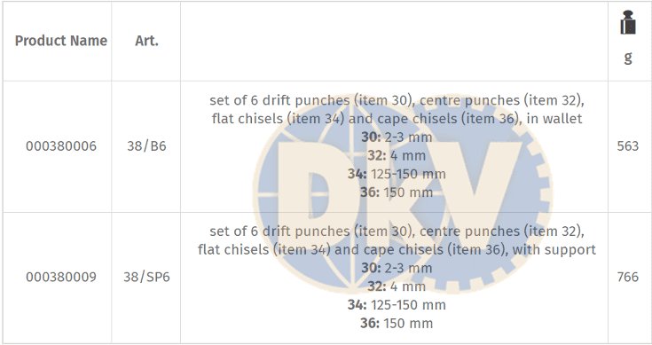 - Bộ đột lỗ Beta 38/SP6, Beta Set of pin punch 38/SP6 (Code: 000380009). Là bộ (6 chiếc), chuyên dùng để đột và đục mở rộng lỗ trong công nghiệp gồm: