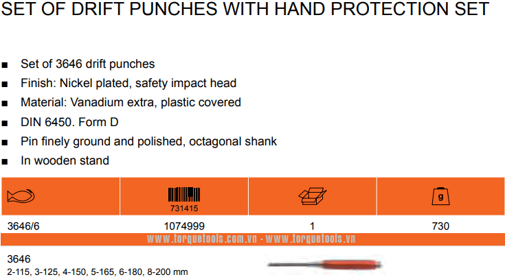 Bộ đột lỗ Bahco 3646/6 được đóng trong khay nhựa, Trọng lượng: gram.