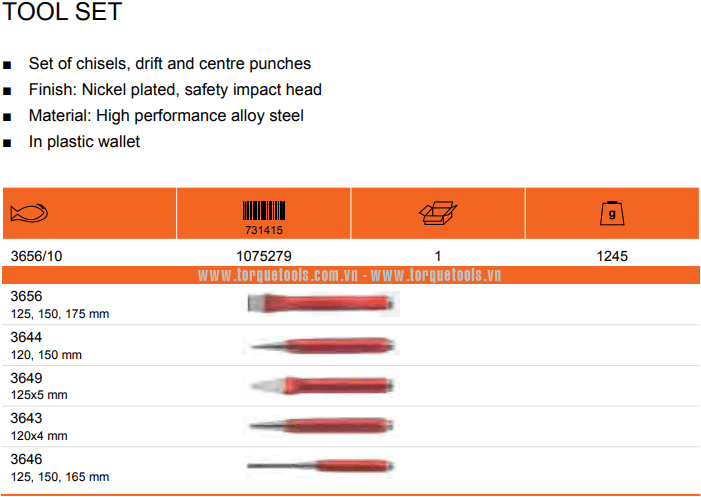 Bộ đột lỗ Bahco 3656/10 được đóng trong khay nhựa, Trọng lượng: 1245 gram.