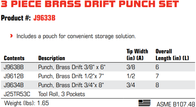 Bộ đột và đục Proto J9633B, Proto punch & chisel combination sets J9633B là bộ gồm 3 chi tiết , chuyên dùng để đột lỗ mở rộng lỗ, đục phá các chi tiết trong công nghiệp.Bộ đột và đục Proto J9633B gồm: