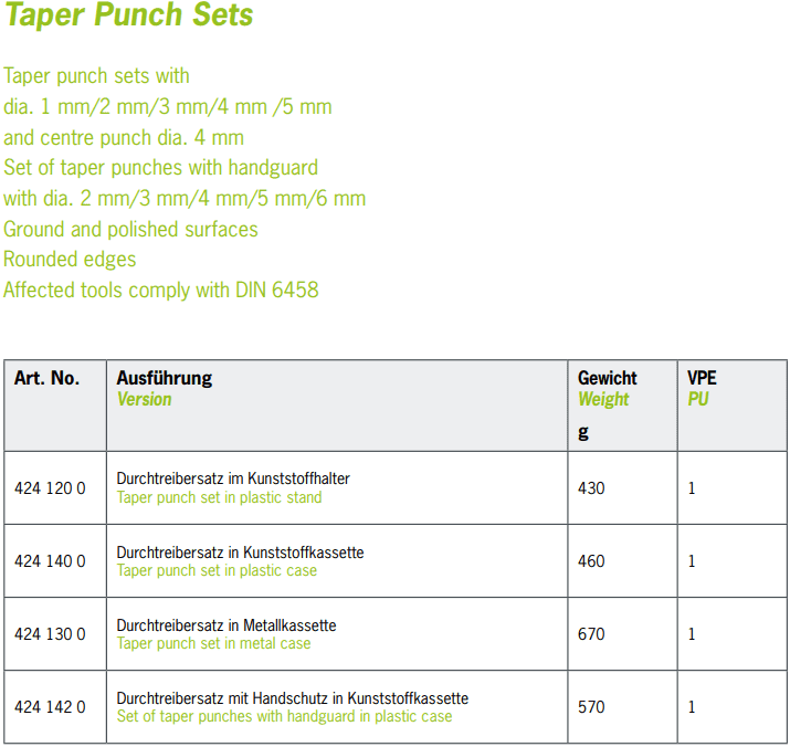 Bộ đột lỗ Rennsteig 424 140 0 được đóng trong khay nhựa, Trọng lượng: 460 gram.
