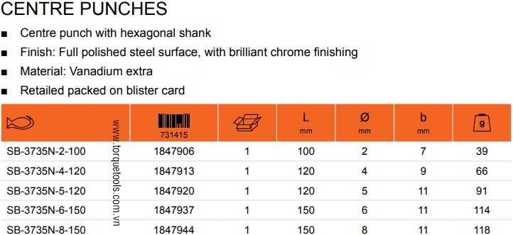 ĐỘT LỖ BAHCO SB-3735N-4-120 | BAHCO PIN PUNCH SB-3735N-4-120 | Ø 4 mm