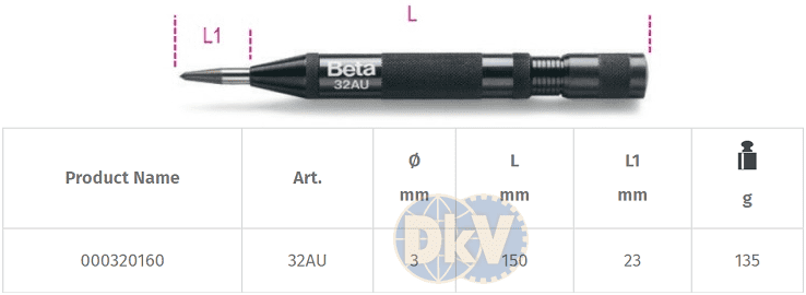 - Đột lỗ Beta 32AU, Beta pin punch 32AU (Code: 000320160). có đường kính đầu đột: Ø 3 mm, chiều dài tổng thể: 150 mm, chuyên dùng để đột mở rộng lỗ trong công nghiệp.