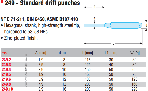 - Đột lỗ Facom 249.8, Facom pin punch 249.8 có đường kính đầu đột: Ø 7.9 mm, đường kính chuôi (lục giác): 12 mm, chiều dài tổng thể: 200 mm, chuyên dùng để đột mở rộng lỗ trong công nghiệp.