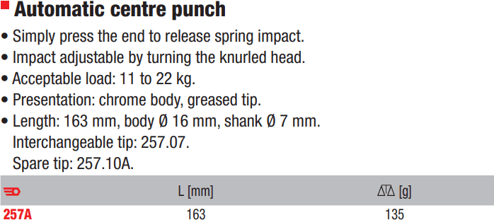 - Đột lỗ Facom 257A, Facom pin punch 257A có đường kính đầu đột: Ø 7 mm, chiều dài tổng thể: 163 mm, chuyên dùng để đột mở rộng lỗ trong công nghiệp.