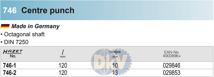 - Đột lỗ Hazet 746-2 được chế tạo bằng phương pháp rèn từ thép dụng cụ (Chrome vanadi). Tiêu chuẩn chế tạo DIN 6453.