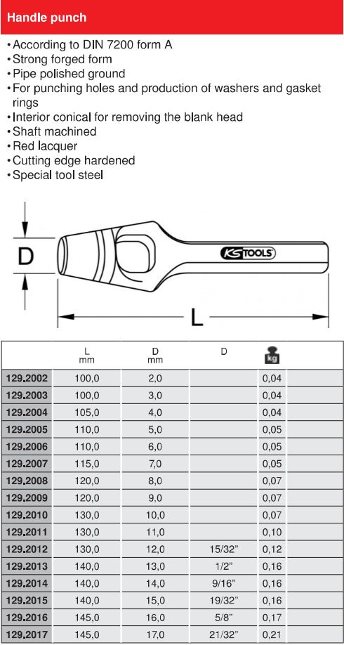 - Đột lỗ KS Tools 129.2006 được chế tạo bằng phương pháp rèn từ thép dụng cụ theo tiêu chuẩn DIN 7200 form A.