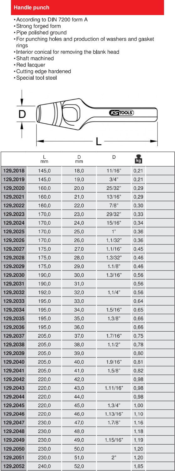 - Đột lỗ KS Tools 129.2047 được chế tạo bằng phương pháp rèn từ thép dụng cụ theo tiêu chuẩn DIN 7200 form A.