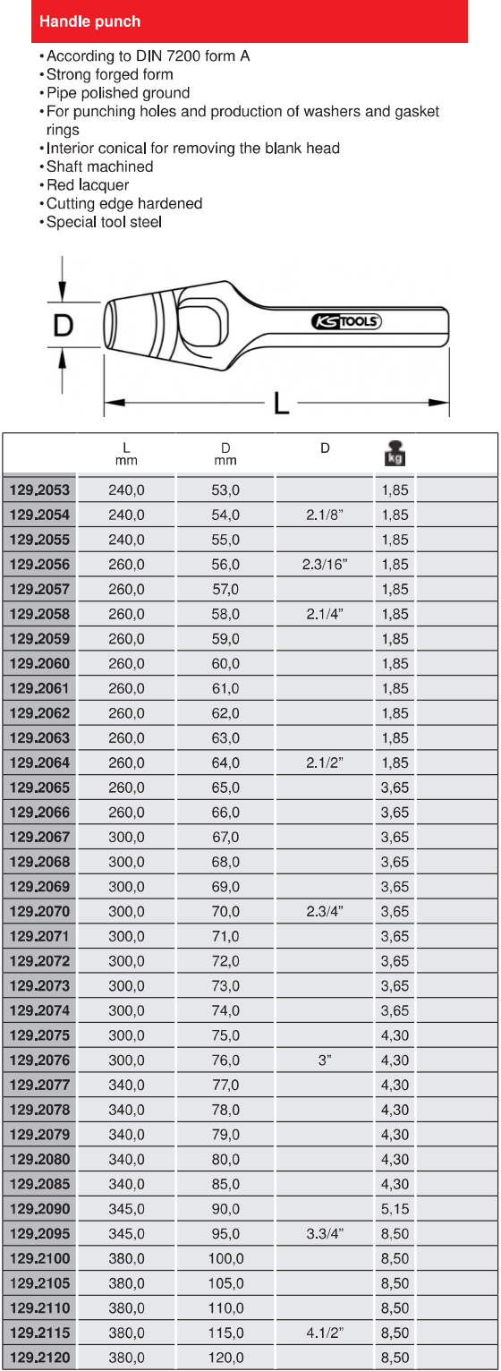 - Đột lỗ KS Tools 129.2110 được chế tạo bằng phương pháp rèn từ thép dụng cụ theo tiêu chuẩn DIN 7200 form A.