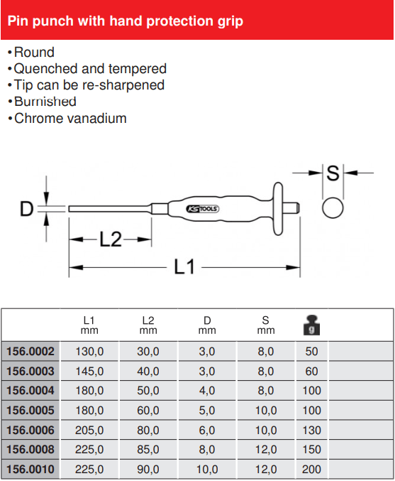 - Đột lỗ KS Tools 156.0008 được chế tạo bằng phương pháp rèn từ thép dụng cụ kết hợp tay cầm bảo vệ hình nón.