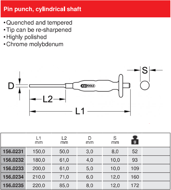 - Đột lỗ KS Tools 156.0232, KS Tools pin punch 156.0232 có đường kính đầu đột: Ø 4 mm, đường kính chuôi: 10 mm, chiều dài tổng thể: 180 mm, chuyên dùng để đột mở rộng lỗ trong công nghiệp.