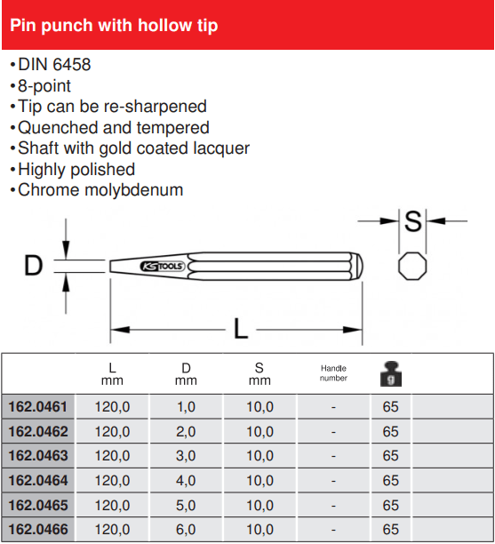 - Đột lỗ KS Tools 162.0461 được chế tạo bằng phương pháp rèn từ thép dụng cụ theo tiêu chuẩn DIN 6458.