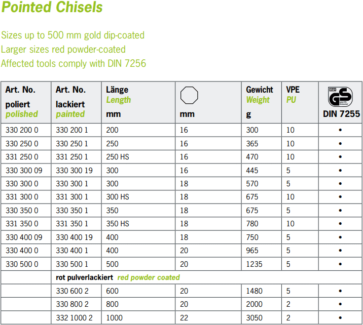 - Đục phẳng Rennsteig 330 200 0 được chế tạo bằng phương pháp rèn từ thép dụng cụ (Chrome vanadi). Tiêu chuẩn chế tạo DIN 6453.