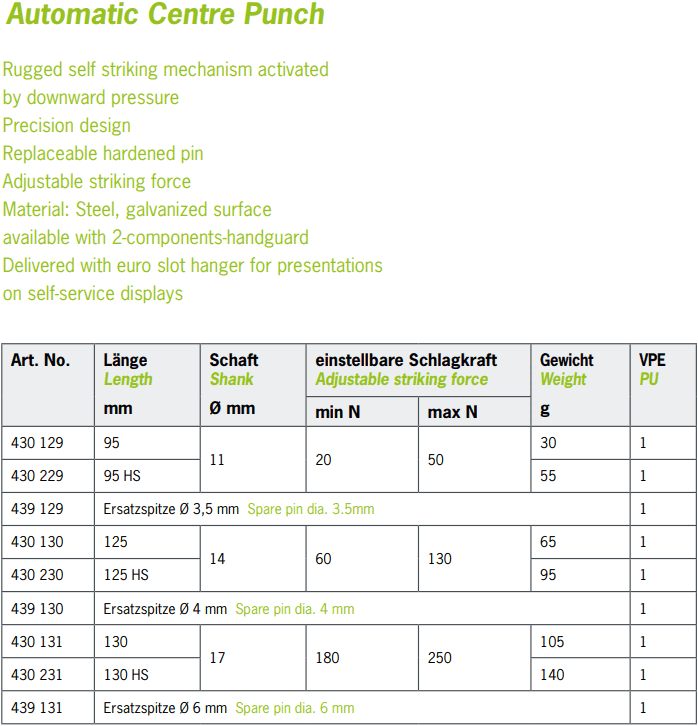 - Đột lỗ Rennsteig 430 131, Rennsteig pin punch 430 131: có đường kính đầu đột: Ø 17 mm, chiều dài tổng thể: 130 mm, chuyên dùng để đột mở rộng lỗ trong công nghiệp.