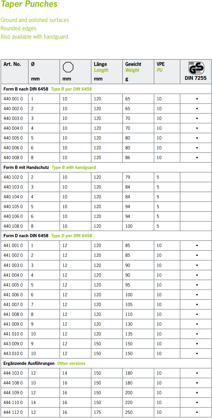 - Đột lỗ Rennsteig 440 108 0, Rennsteig pin punch 440 108 0: có đường kính đầu đột: Ø 8 mm, chiều dài tổng thể: 120 mm, chuyên dùng để đột mở rộng lỗ trong công nghiệp.