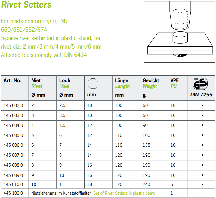 - Đột lỗ Rennsteig 445 006 0, Rennsteig pin punch 445 006 0: có đường kính đầu đột: Ø 6 mm, chiều dài tổng thể: 110 mm, chuyên dùng để đột mở rộng lỗ trong công nghiệp.