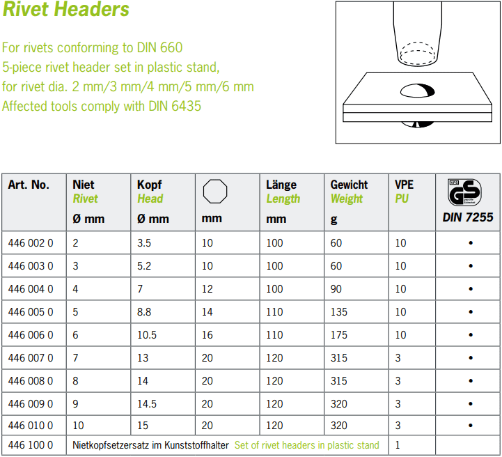 - Đột lỗ Rennsteig 446 002 0, Rennsteig pin punch 446 002 0: có đường kính đầu đột: Ø 2 mm, chiều dài tổng thể: 100 mm, chuyên dùng để đột mở rộng lỗ trong công nghiệp.