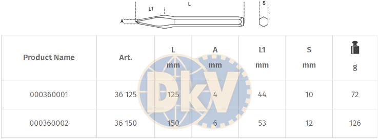 - Đục lỗ Beta 36 125, Beta Flat Chisesl 36 125(Code: 000360001). có đường kính đầu đột: Ø 4 mm, đường kính chuôi: 10 mm, chiều dài tổng thể: 125 mm, chuyên dùng để đục mở rộng lỗ trong công nghiệp.