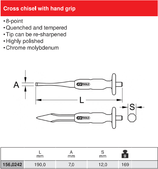 - Đục nhọn KS Tools 156.0242, KS Tools Cross Chisel 156.0242 có tiết diện đục: 7 mm, đường kính chuôi: 12 mm, chiều dài tổng thể: 190 mm, chuyên dùng để đục phá trong công nghiệp.
